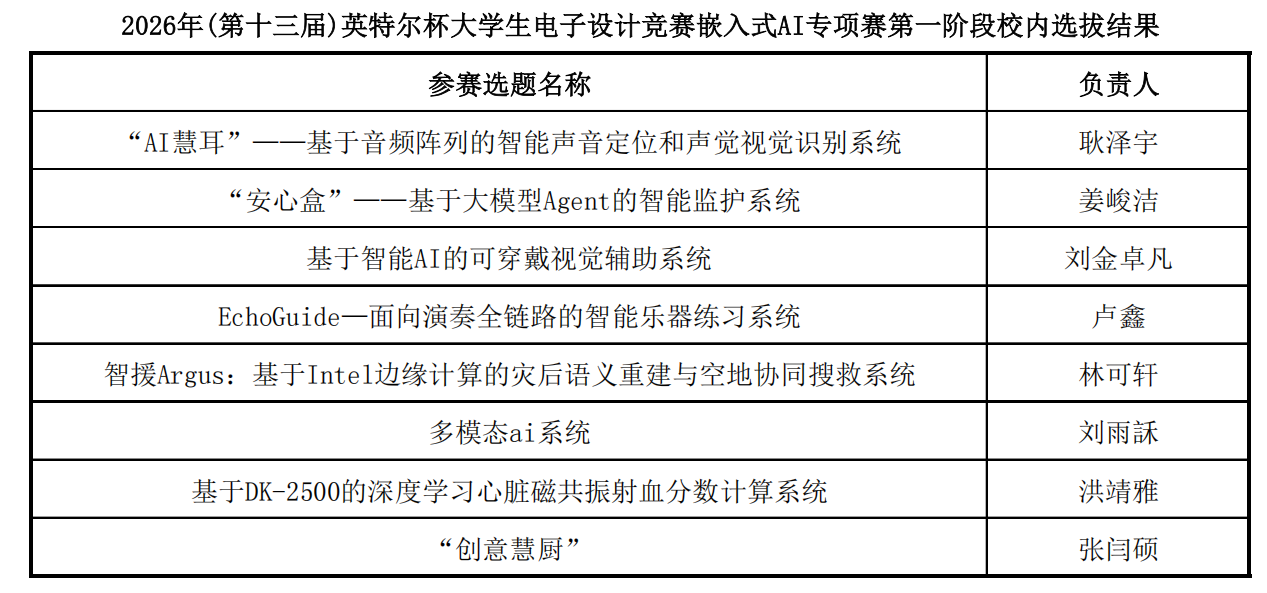 关于公示 2026年(第十三届)英特尔杯大学生电子设计竞赛嵌入式AI专题赛第一阶段校内选拔结果的通知